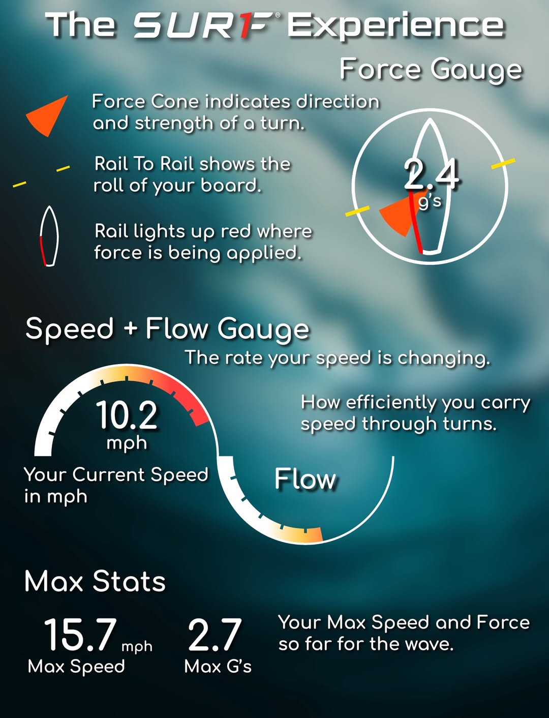 See where and when you slow down or speed on a wave, and learn how to control it even better.